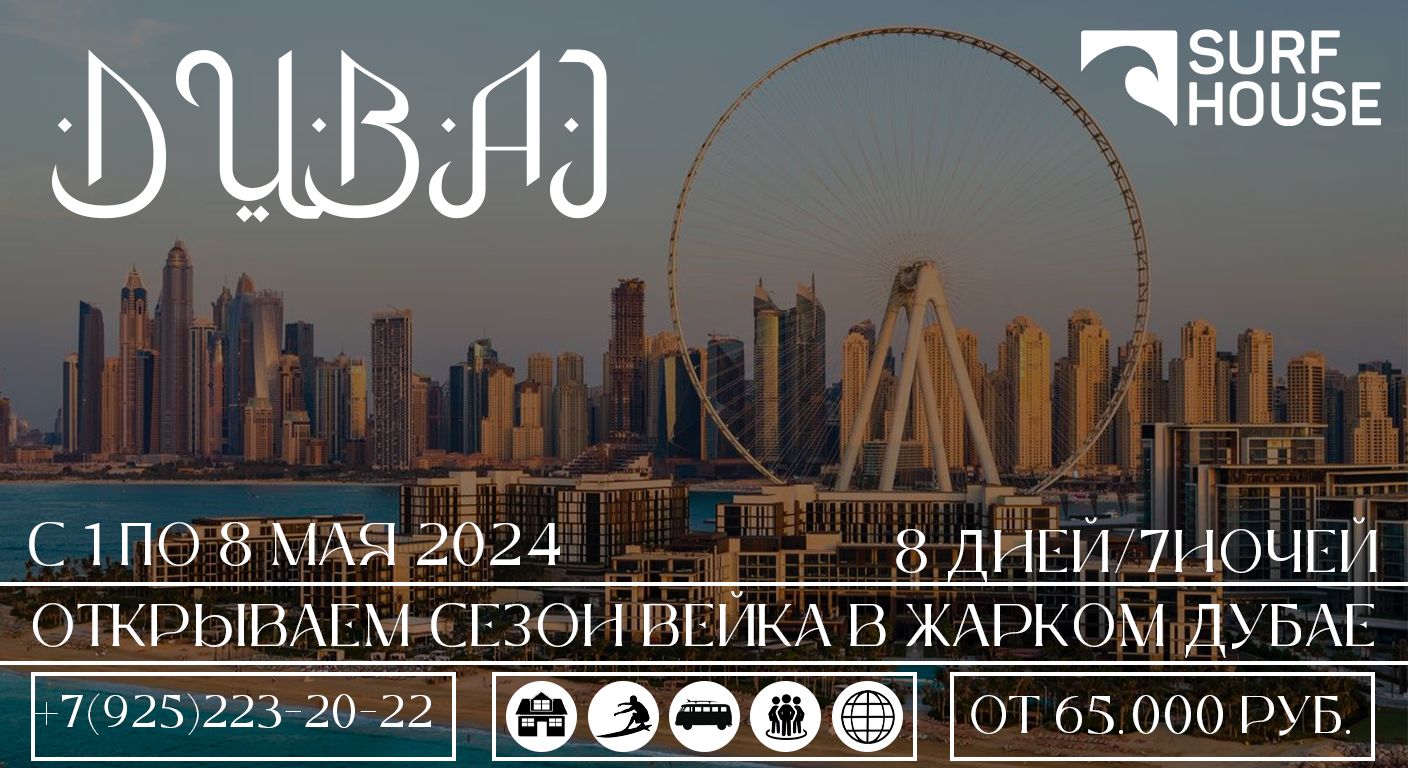 Дубай встретит нас ярким солнцем и соленой водой Персидского залива красивого бирюзового цвета. Мы будем совершенствоваться в вейксерфинге, посетим недавно открывшееся серф ранчо Келли Кластера в Абу-Даби, сыграем в гольф, кто-то успеет даже пойти на шопинг и позагорать. В общем, хорошо отдохнем и покатаемся перед сезоном в Москве.